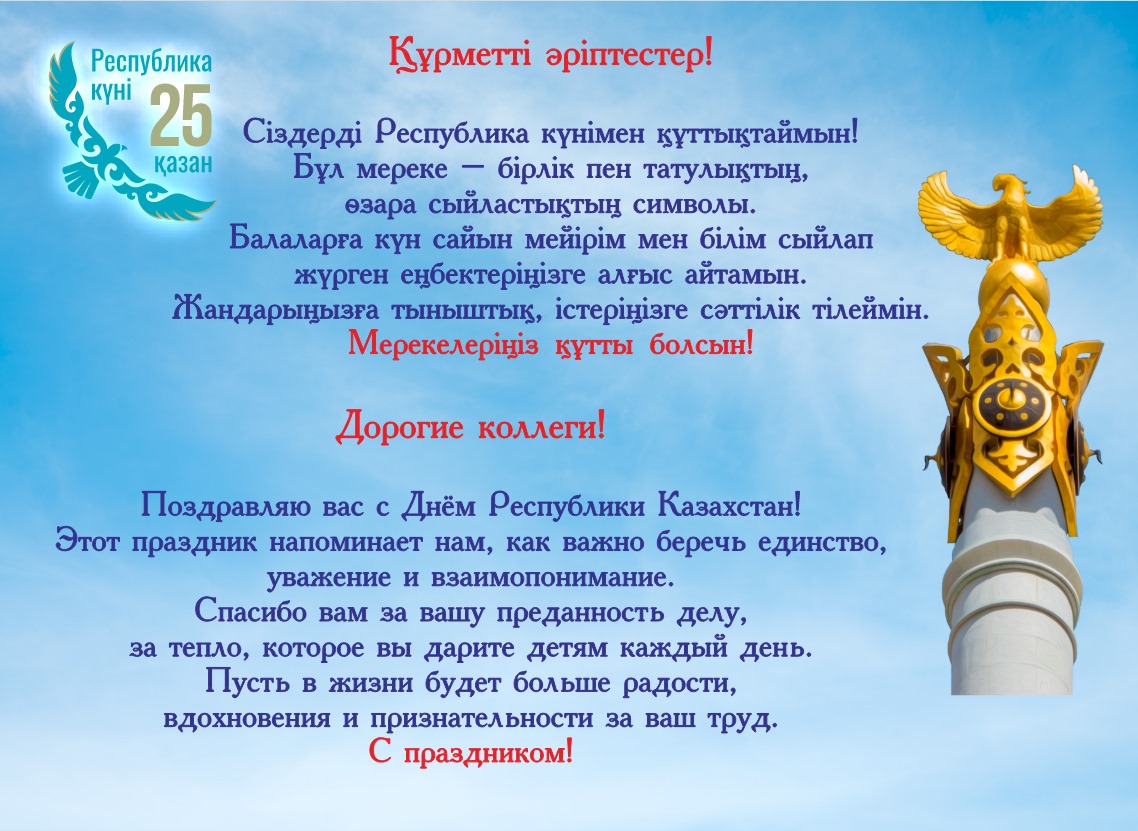 Дорогие коллеги! Поздравляю вас с Днём Республики Казахстан! Этот праздник напоминает нам, как важно беречь единство, уважение и взаимопонимание. Спасибо вам за вашу преданность делу, за тепло, которое вы дарите детям каждый день. Пусть в жизни будет больше радости, вдохновения и признательности за ваш труд. С праздником!