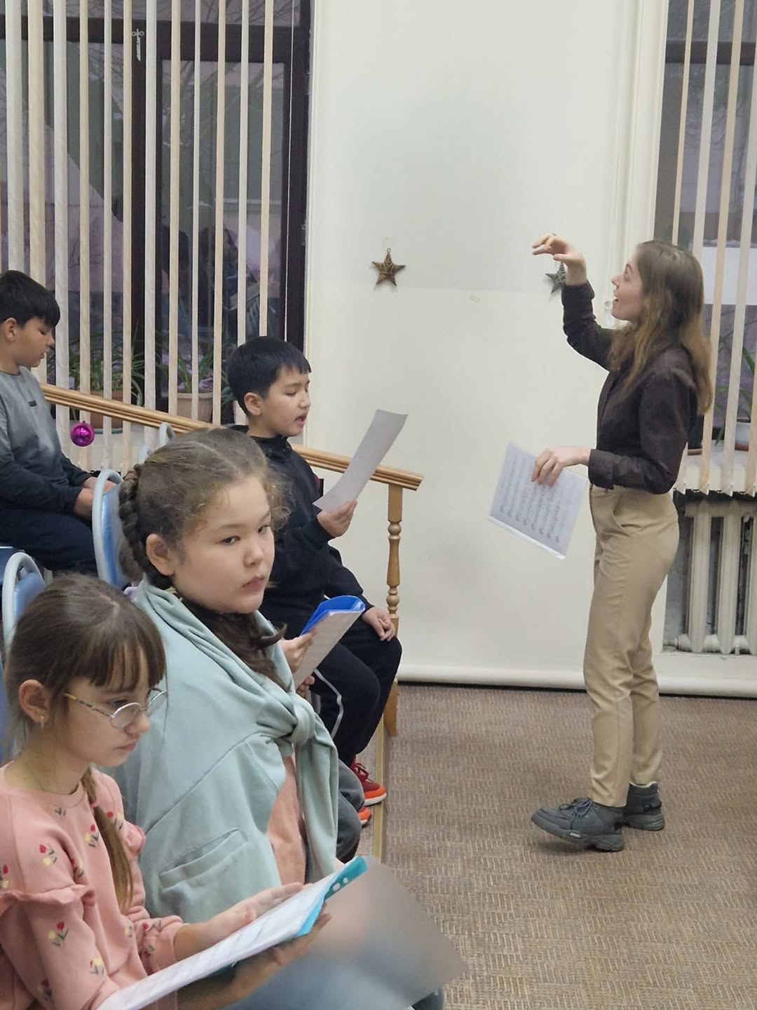 В ходе занятия юные хористы продемонстрировали вокально-хоровые навыки, дыхательные упражнения и работу над фрагментом произведения В. Решетина «Метелица».